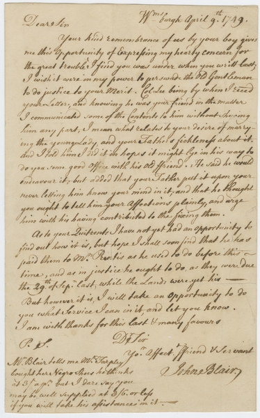 Marriage in colonial Virginia was seldom simply an affair of the heart. In the seventeenth century when the number of men greatly exceeded the number of women, women often had their choice of a male partner, regardless of their social or economic background. However, by the time Martha came of age in the middle of the eighteenth century, the ratio of white women to white men had evened out. Women no longer enjoyed a proportionate advantage. Family wealth came to play an increasingly important part in determining a woman’s marital prospects. A handsome dowry given by the bride’s father would help insure that a woman might marry into a good family