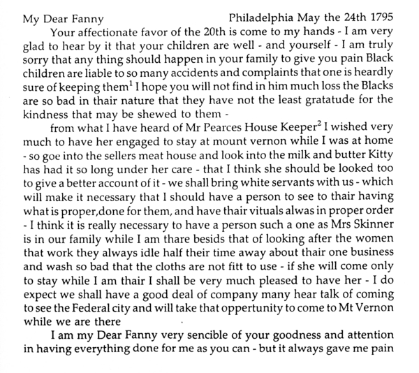 It is impossible to understand Martha Washington without appreciating the importance of slavery in her life. In the Virginia society in which she lived, slaves provided the most crucial source of labor in the economy, a significant portion of a person’s wealth, and a visible symbol of a family’s social status.