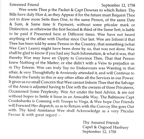Letter, from Capel and Osgood Hanbury, September 12, 1758