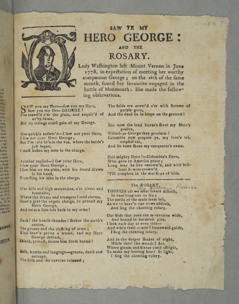 "Broadside ballad, Saw Ye My Hero George," in Martha Washington, Item #310, https://marthawashington.us/items/show/310 (accessed April 6, 2021).