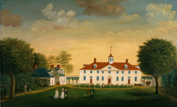 This iconic view of the west front of Mount Vernon is the earliest known pictorial representation of the house and grounds. There is a similar painting of the east front. This view is particularly interesting for its portrayal of domesticity. In the foreground George and Martha Washington walk alongside Nelly Custis. Another of Martha’s grandchildren, George Washington Parke Custis, is nearby, standing alongside a pair of hounds. Washington’s slaves and guests also populate the scene (image courtesy of Mount Vernon Ladies' Association).