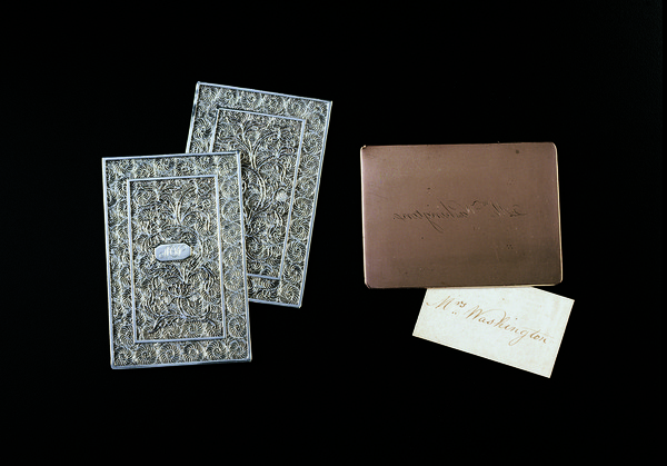As First Lady, Martha Washington entered into an important and new public role. Just as with the President, there was debate over what her official title should be. Suggestions included “Lady” and “Marquise.” Early on, Martha herself decided that she should be addressed simply as “Mrs. Washington,” which was printed on her official calling cards. One of these is pictured here, along with an elaborate calling card case owned by Martha. (Courtesy of Arlington House, the Robert E. Lee Memorial.)